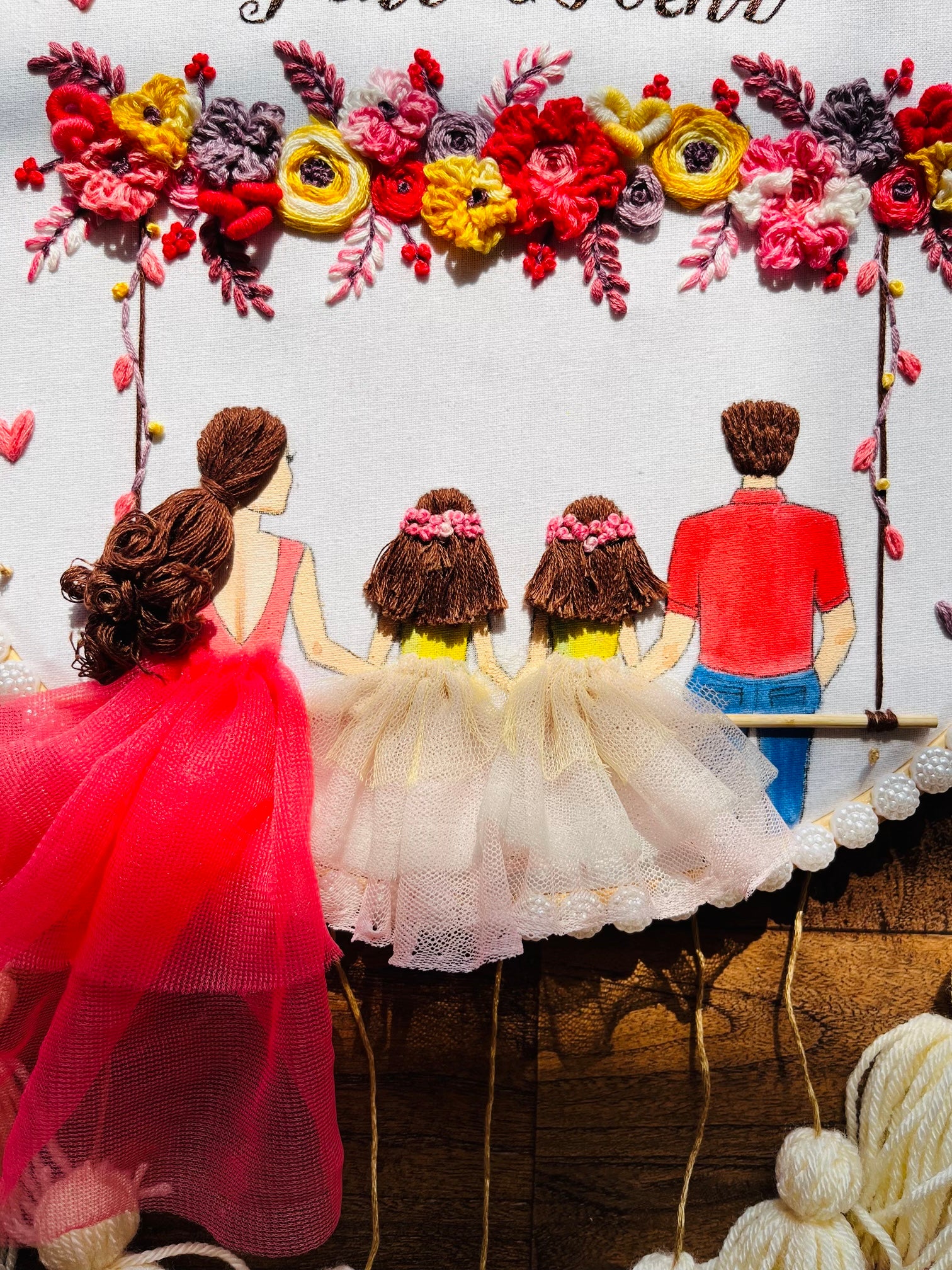 Celebrate the warmth of family with this handcrafted embroidery hoop art, designed to capture your unique story. Featuring your loved ones in custom outfits, personalized names or quotes, and colorful tassels, this piece is more than just décor — it’s an emotion!