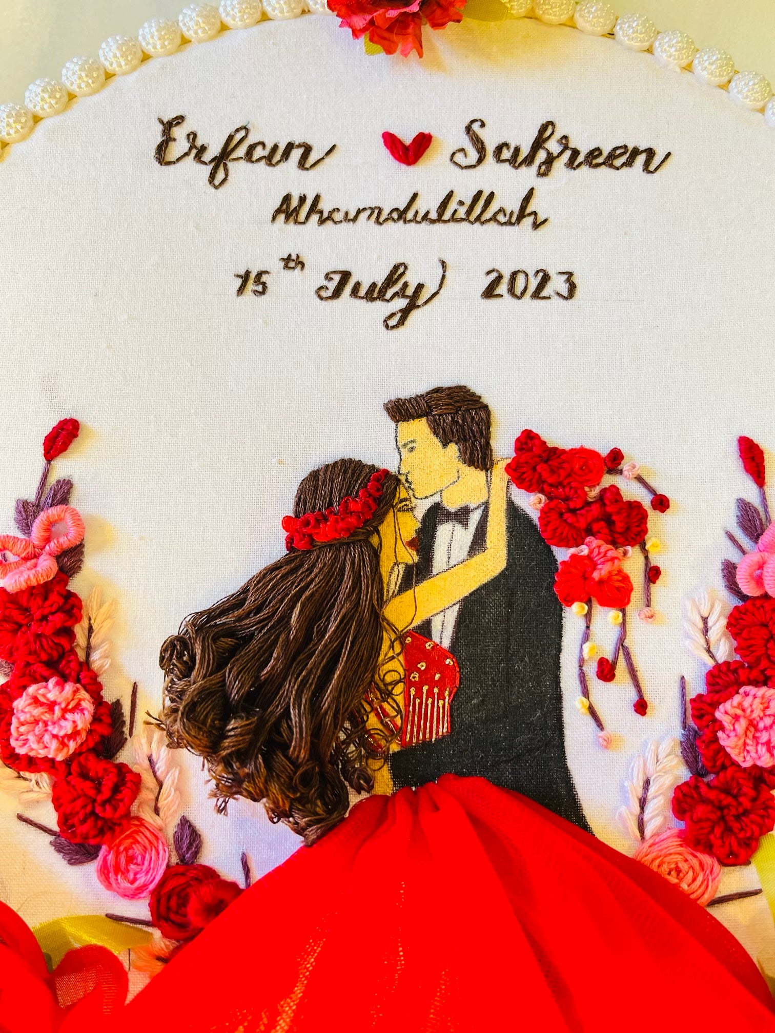 Celebrate love with this elegant handcrafted hoop featuring a beautifully embroidered couple in a romantic embrace. The bride’s voluminous tulle gown, enhanced with lace, brings a luxurious 3D effect to the artwork. Surrounded by intricate floral embroidery and faux blooms, this hoop radiates warmth, joy, and personalized charm.