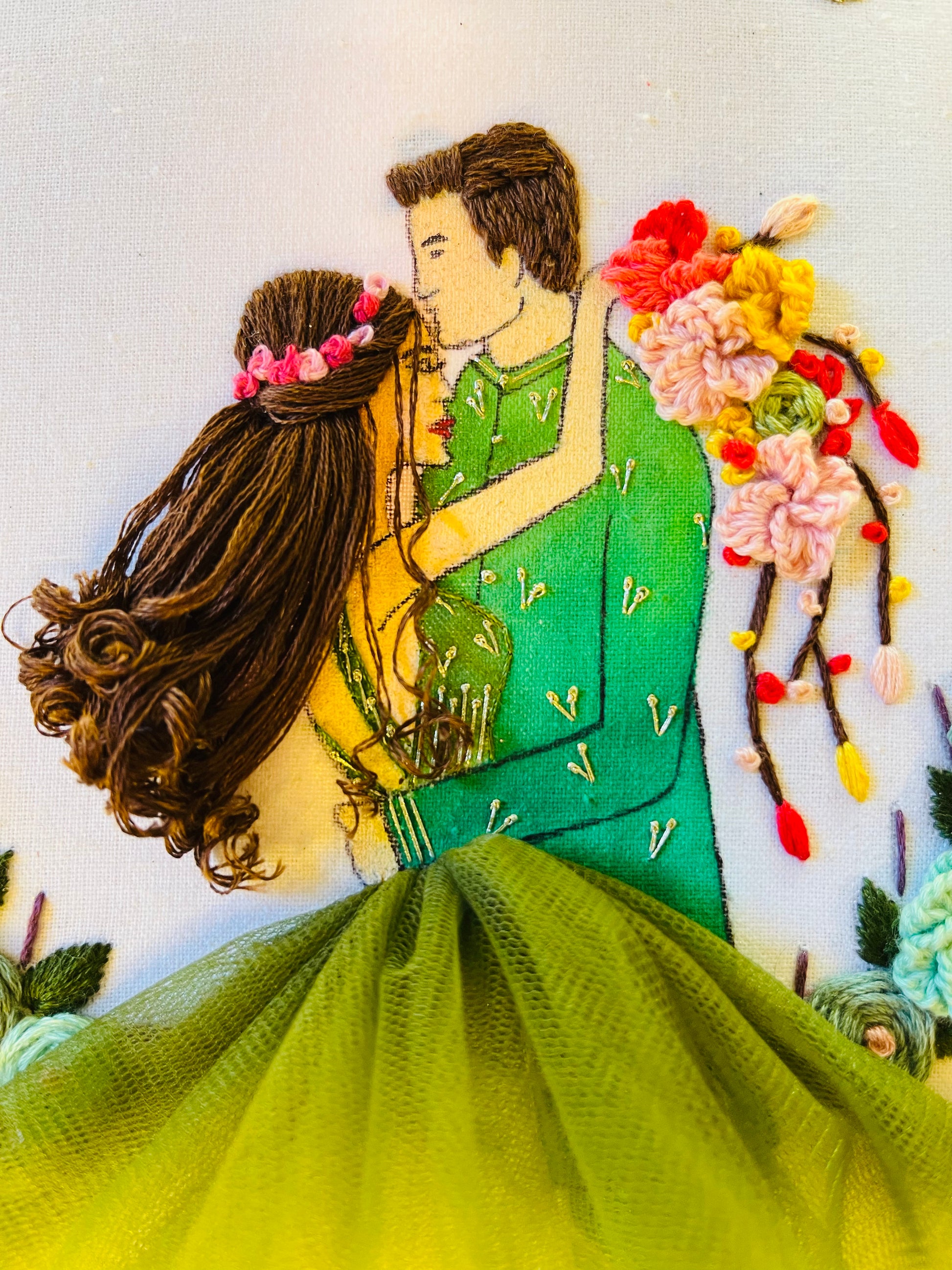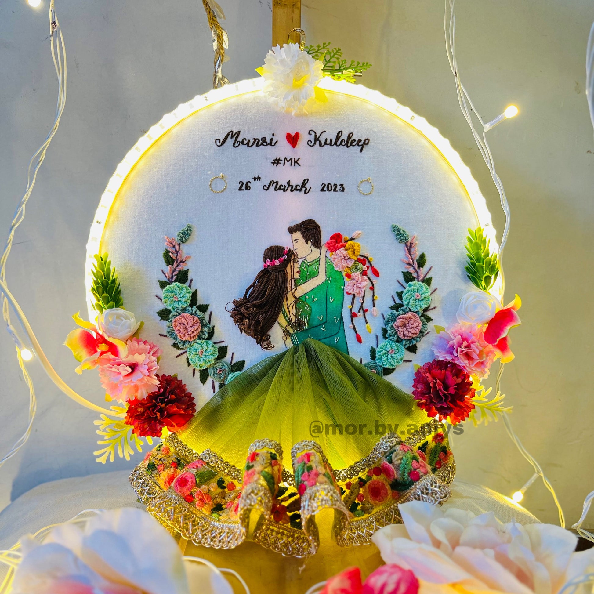 Surrounded by floral embroidery and faux blooms, the hoop is fully customizable — from the couple’s outfits to the names, date, and hashtag — making it a perfect keepsake for weddings, engagements, or anniversaries.