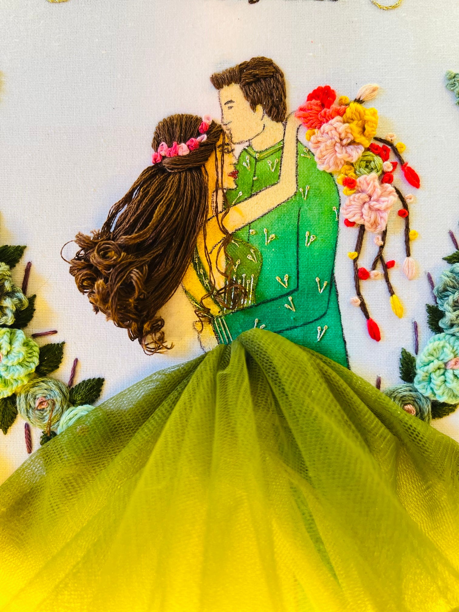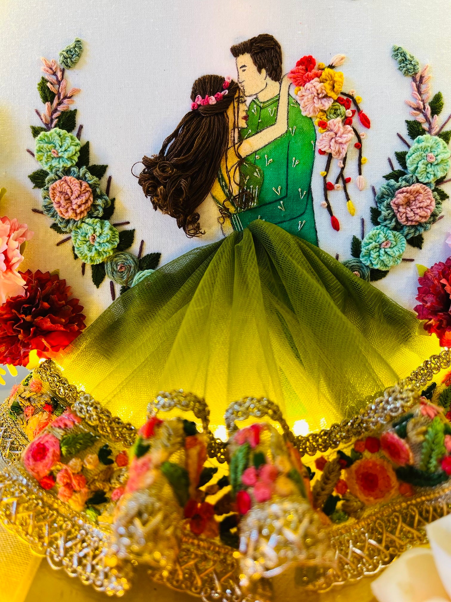 Celebrate love with this stunning handcrafted hoop, now enhanced with a warm LED light border that adds a magical glow to your special moment. Featuring a beautifully embroidered couple in a romantic pose, this frame is adorned with a voluminous tulle gown finished with lace for an elegant 3D effect.