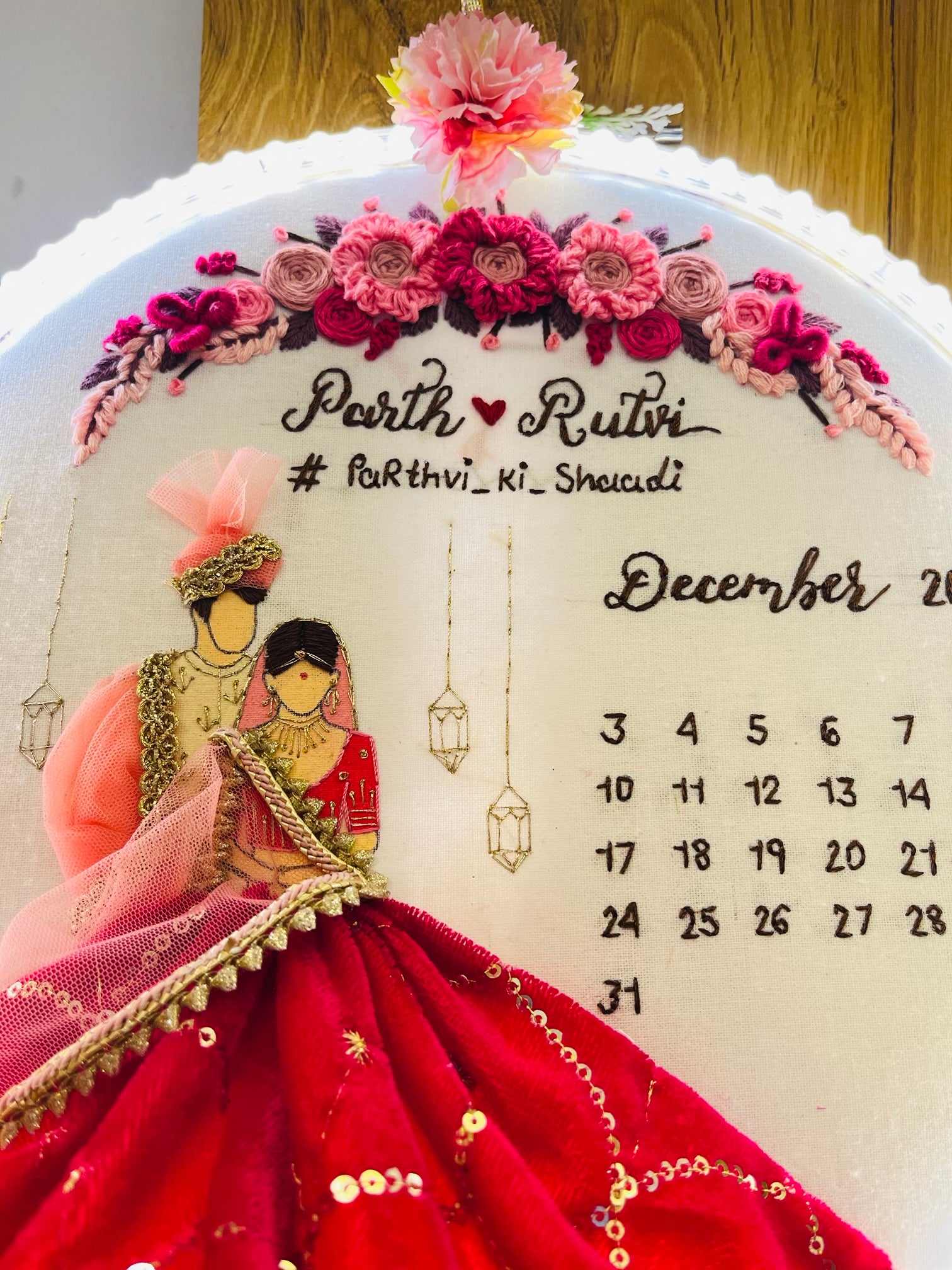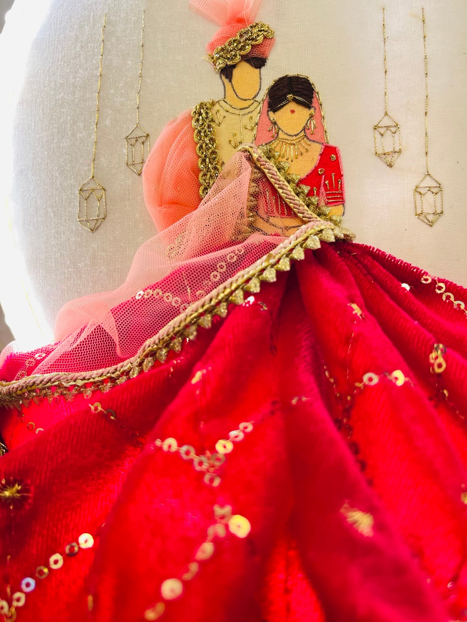 Intricately hand-embroidered, this artwork features the bride and groom in their majestic Indian wedding attire — with fine details like the groom’s embroidered sherwani and turban, and the bride’s vibrant red lehenga and dupatta, complete with mirror and zari work. The 3D fabric adds a touch of realism and richness.