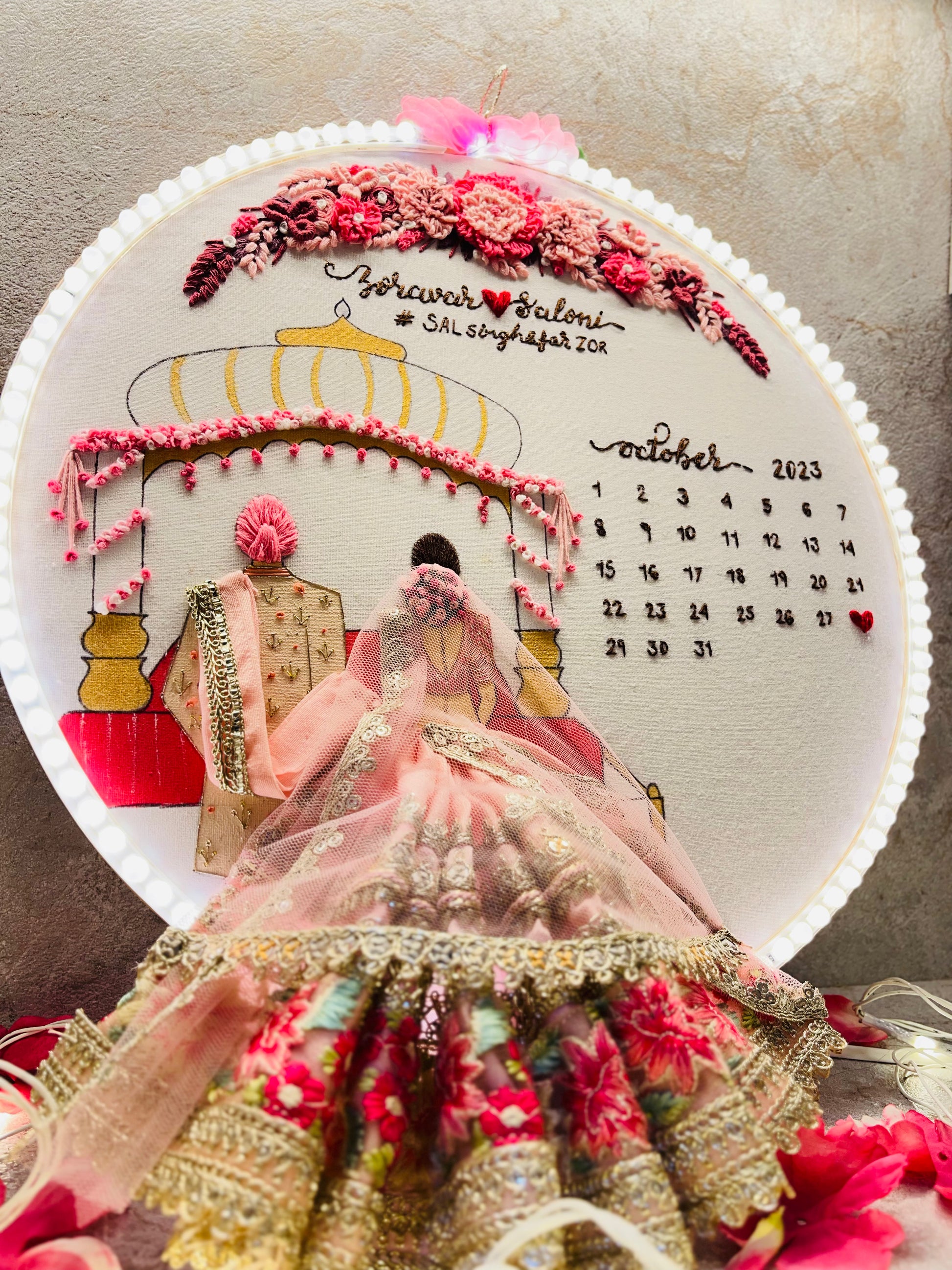 Celebrate the sacred union of love and tradition with our Punjabi Wedding Hoop Art, thoughtfully handcrafted to depict a heartfelt moment of the bride and groom praying at the Gurudwara.