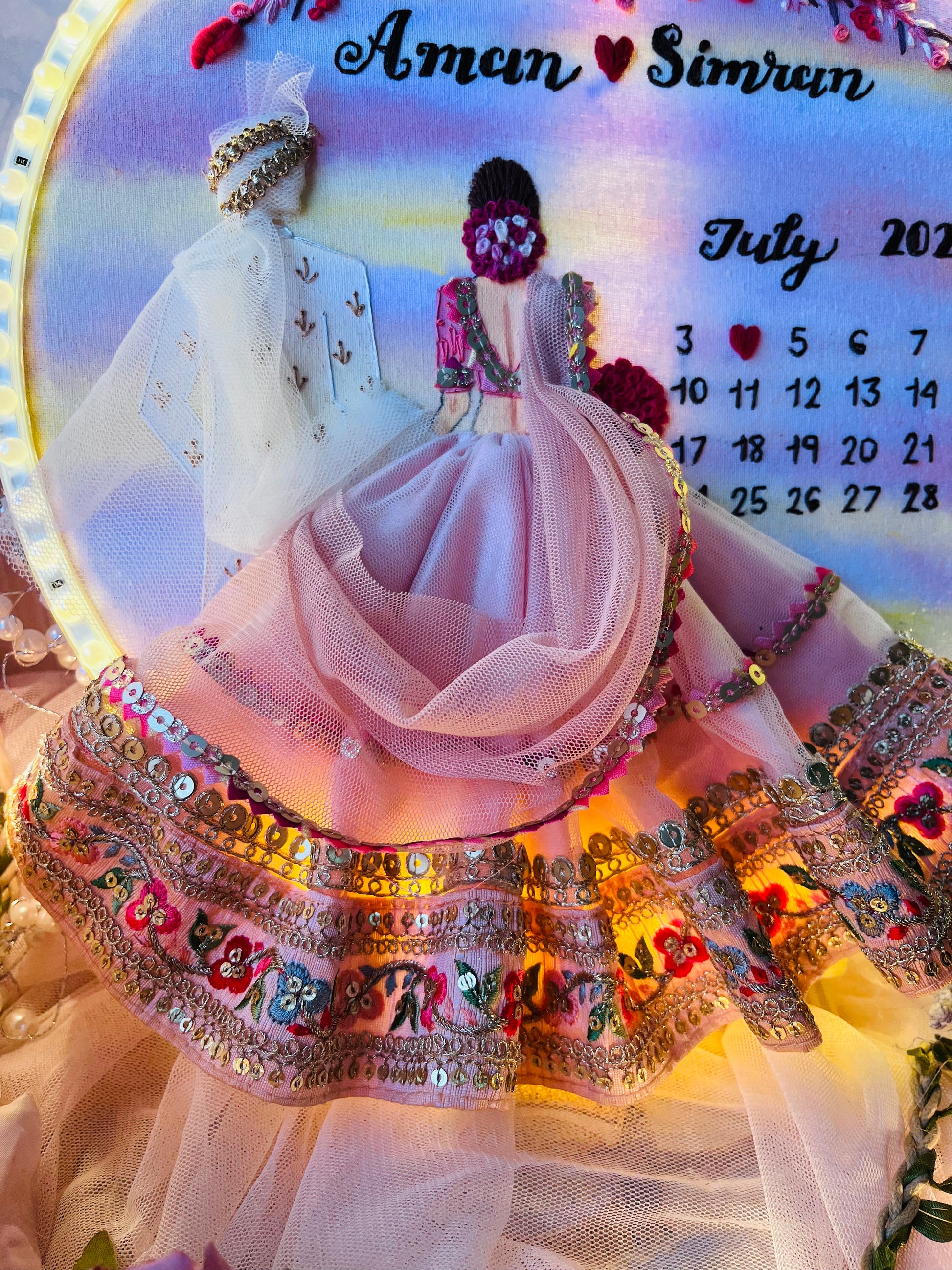 Commemorate your Hindu wedding day with this stunning handcrafted embroidery hoop, radiating elegance and tradition. Featuring a beautifully embroidered couple in traditional Indian wedding attire, this custom piece highlights your special date on a mini calendar — all glowing under warm LED lights.