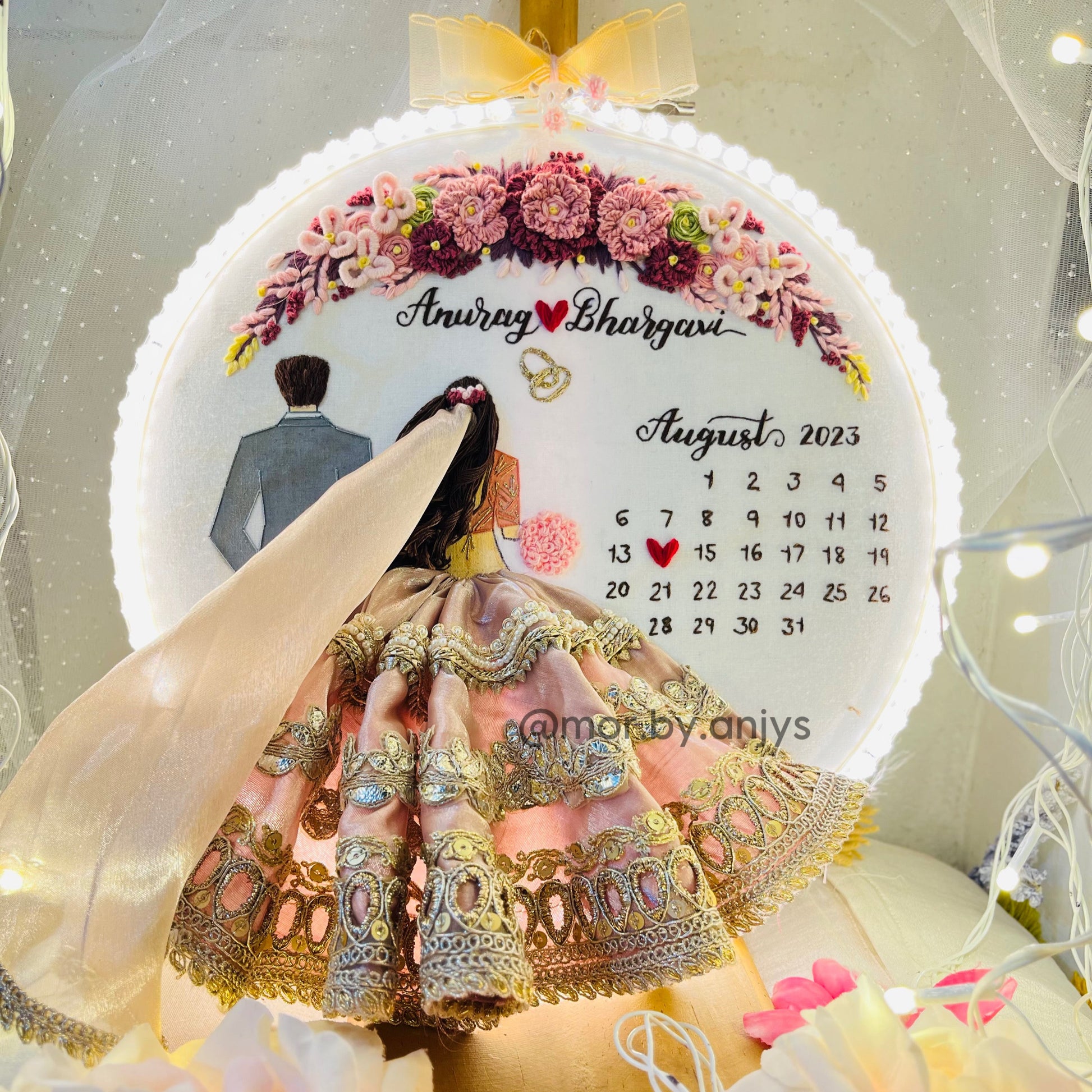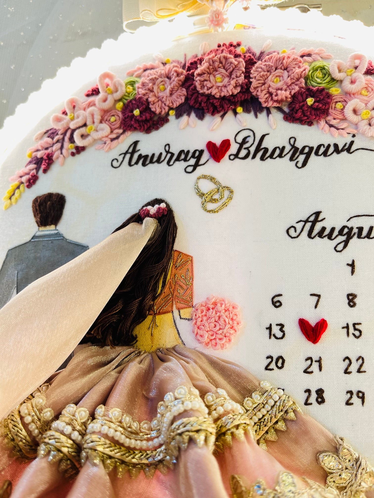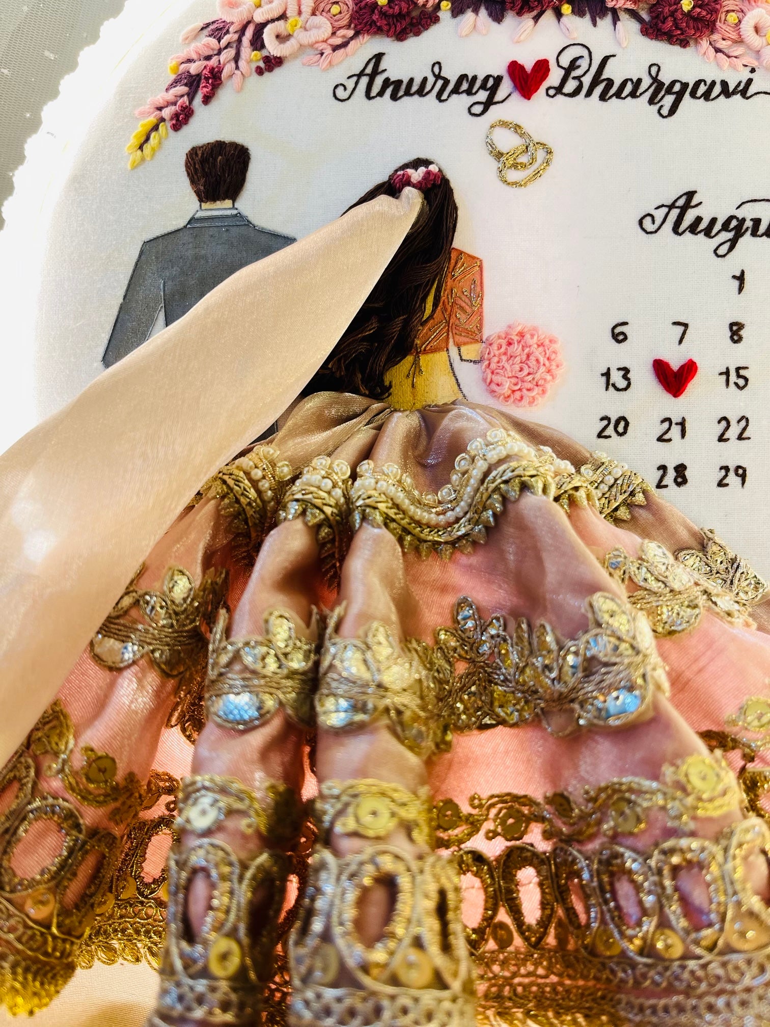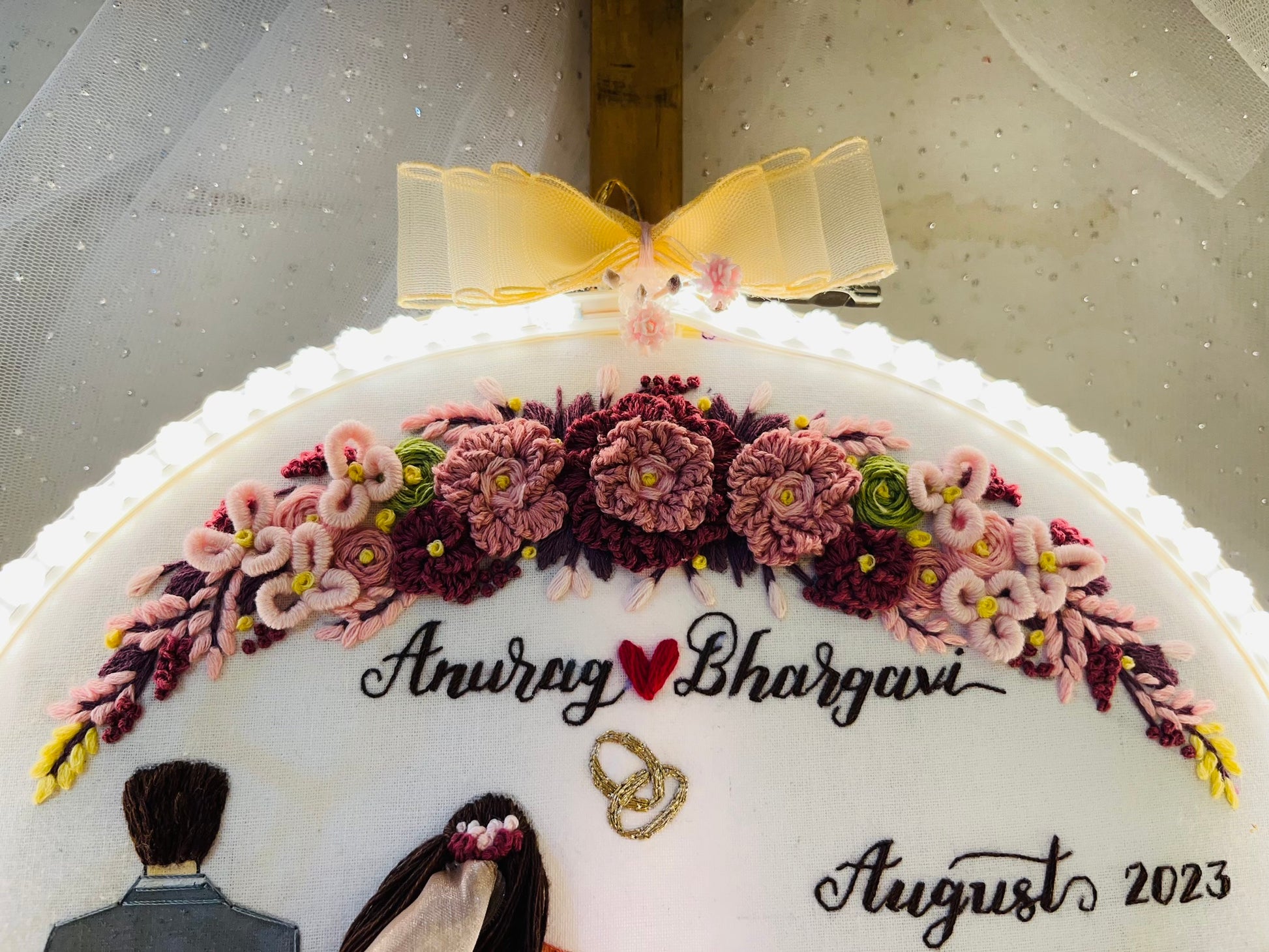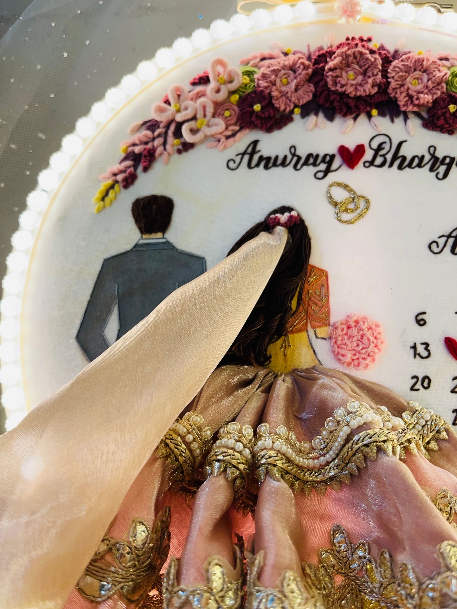 The Glow Edition – Signature Hoopart is our most exquisite creation—where fine embroidery meets soft ambient lighting, turning your wedding memory into a glowing masterpiece. Featuring the couple’s back pose, this hoop is adorned with luxurious floral embroidery, and fully customized outfits, down to accessories like latkans, sehra, or bridal jewelry—all brought to life with delicate, warm LED lights.