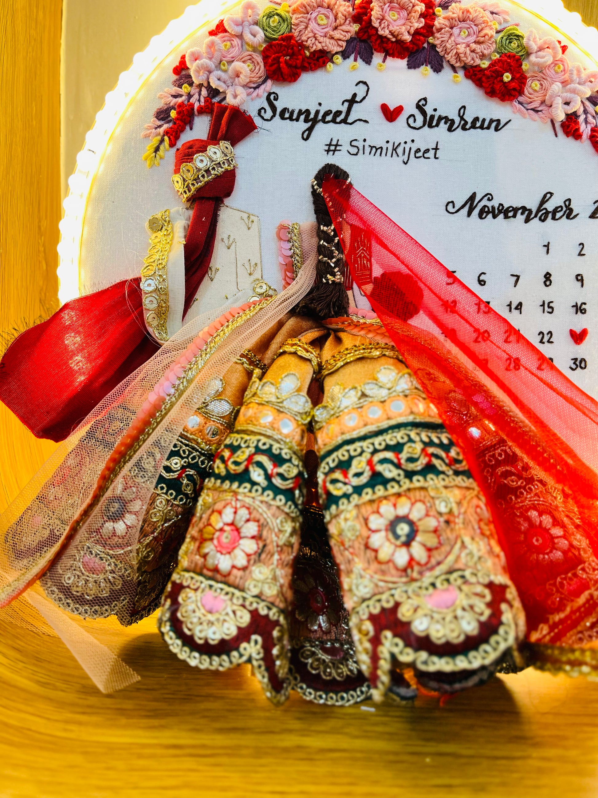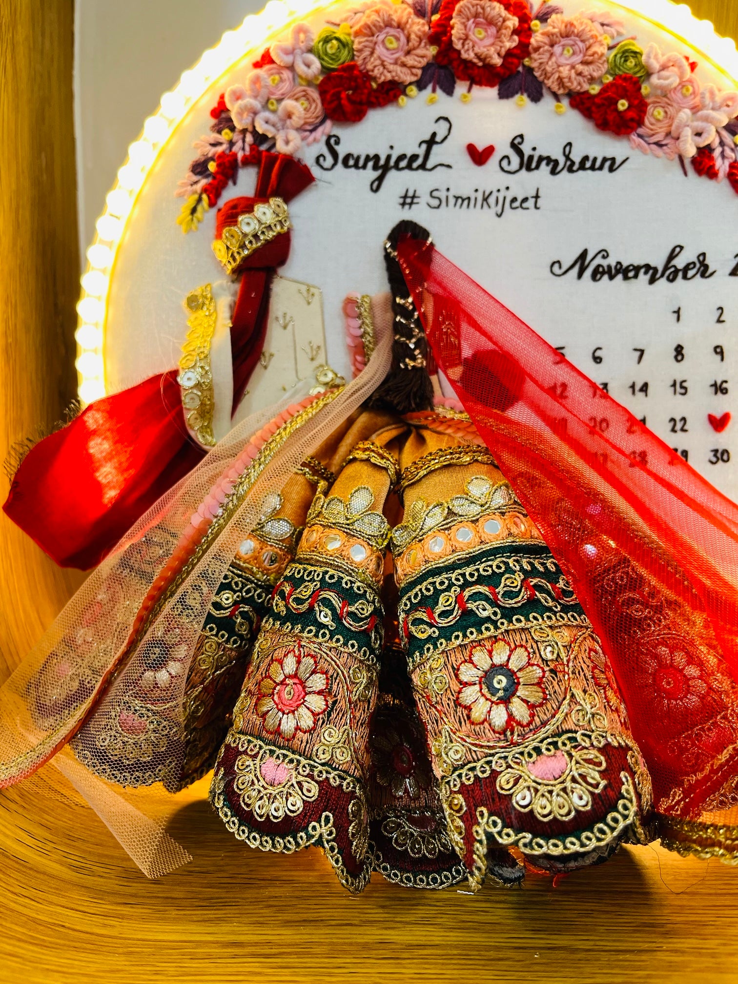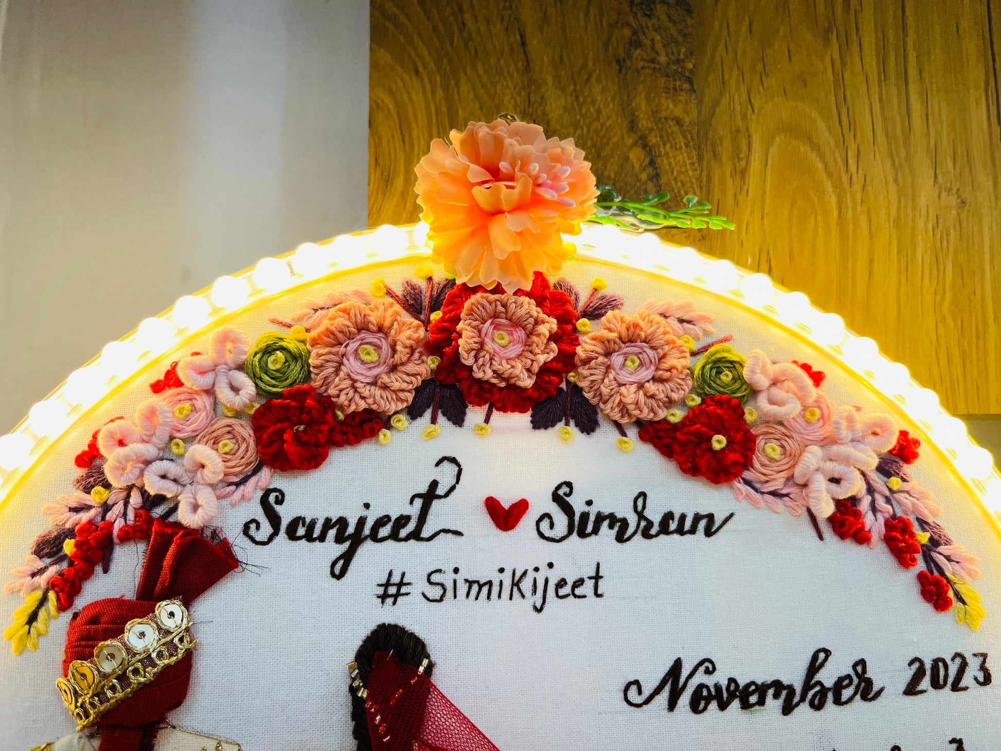 The Glow Edition – Signature Hoopart is our most exquisite creation—where fine embroidery meets soft ambient lighting, turning your wedding memory into a glowing masterpiece. Featuring the couple’s back pose, this hoop is adorned with luxurious floral embroidery, and fully customized outfits, down to accessories like latkans, sehra, or bridal jewelry—all brought to life with delicate, warm LED lights.