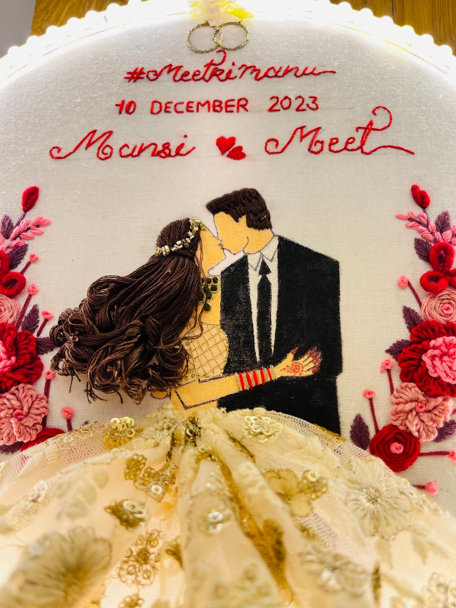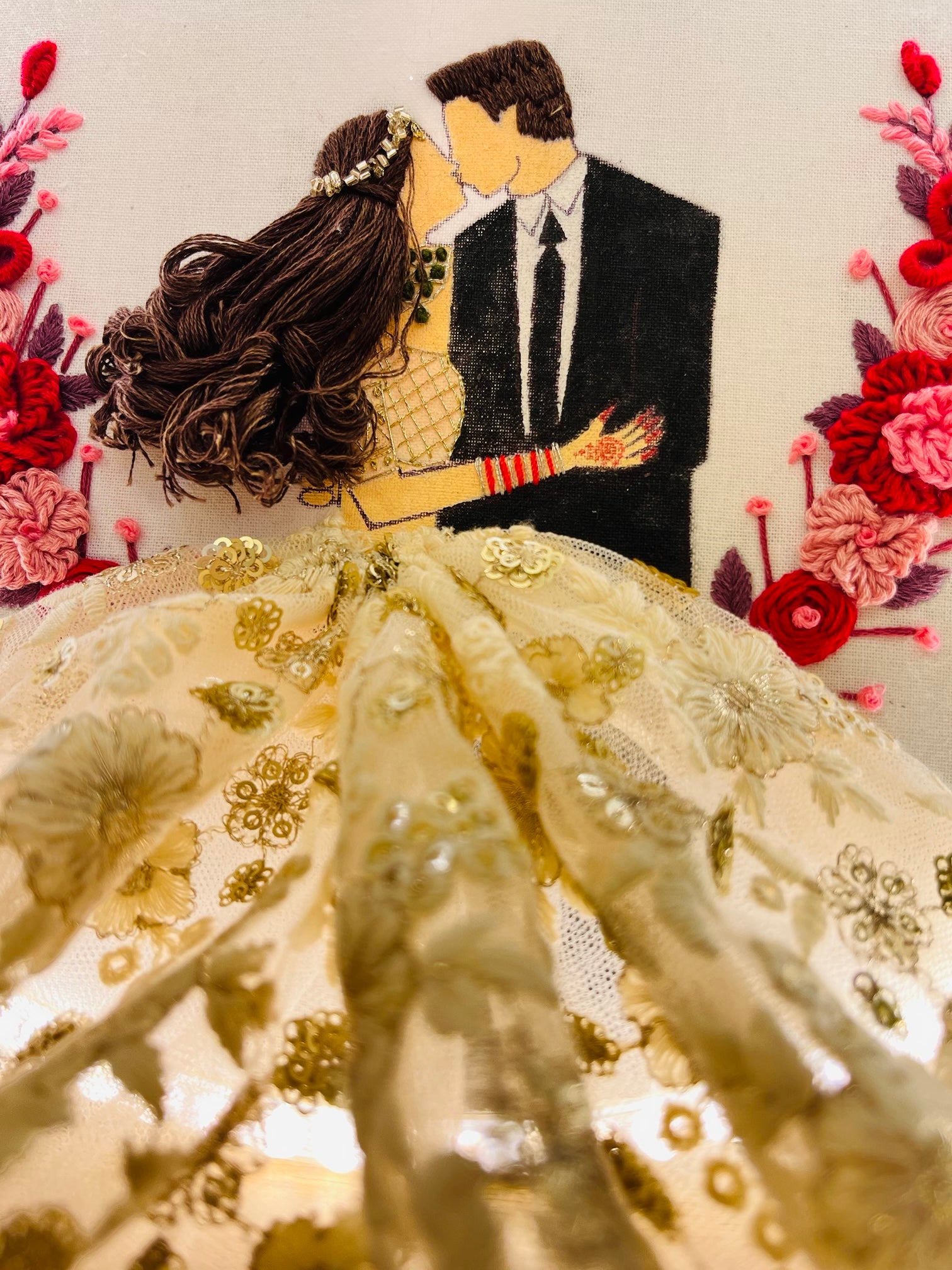 Adorned with 3D floral elements and a flowing embroidered gown, this piece captures the magic of love stories with luxurious detail. The bride’s lehenga features shimmering fabric, delicate lace, and realistic flow, while the groom is styled in a classic suit — all stitched with precision and emotion.