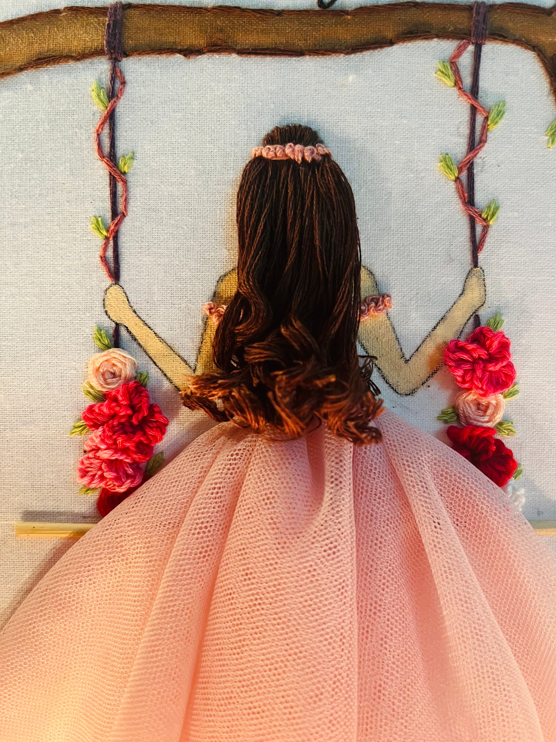 Celebrate the love that surrounds your little girl with this beautifully handcrafted hoopart. Featuring a sweet girl seated on a floral swing under a textured tree branch, her flowing 3D pink gown and soft curled hair make the artwork come to life.