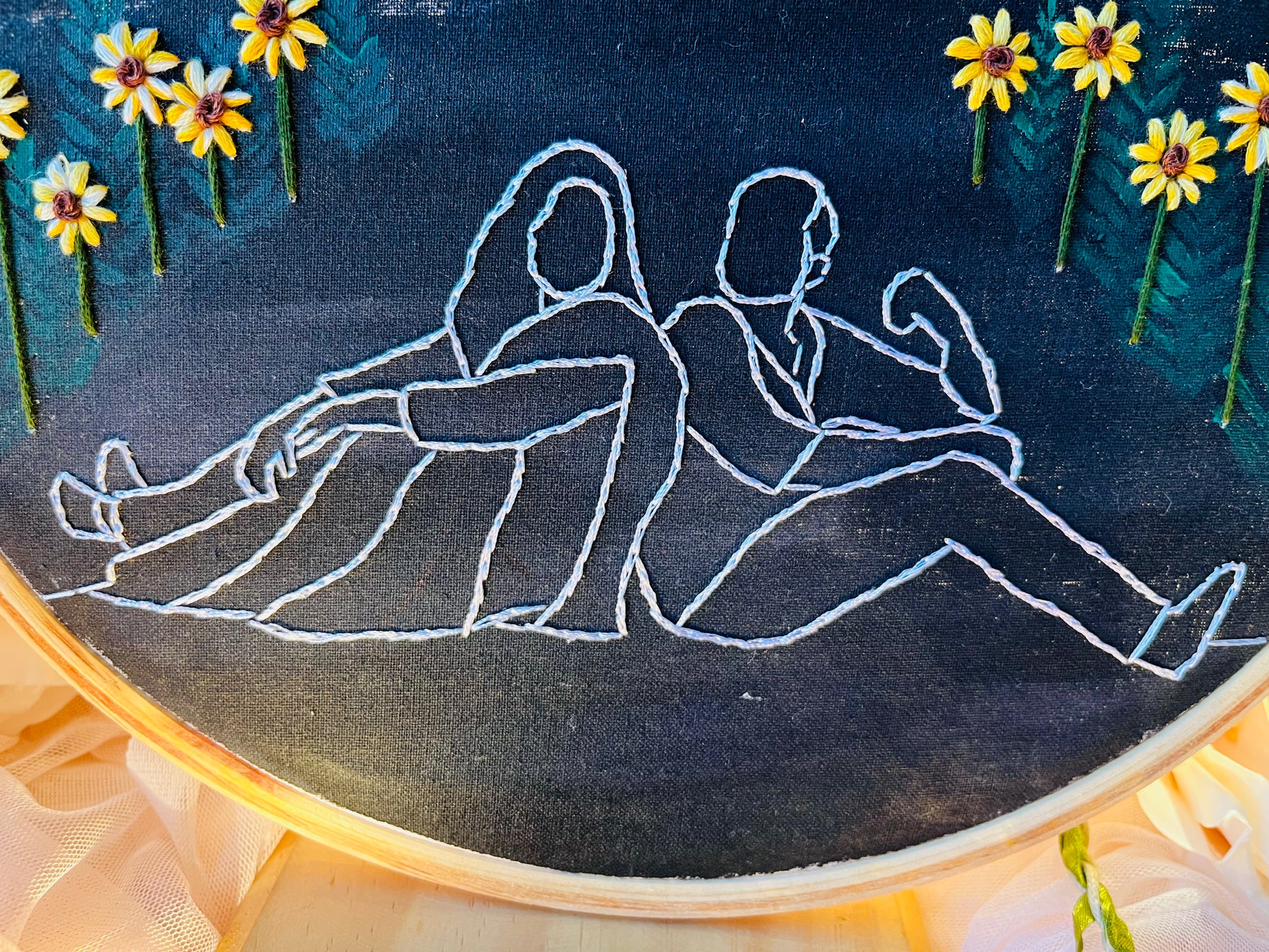A stitched line-art silhouette of a couple sitting back-to-back, recreated from a real photograph.