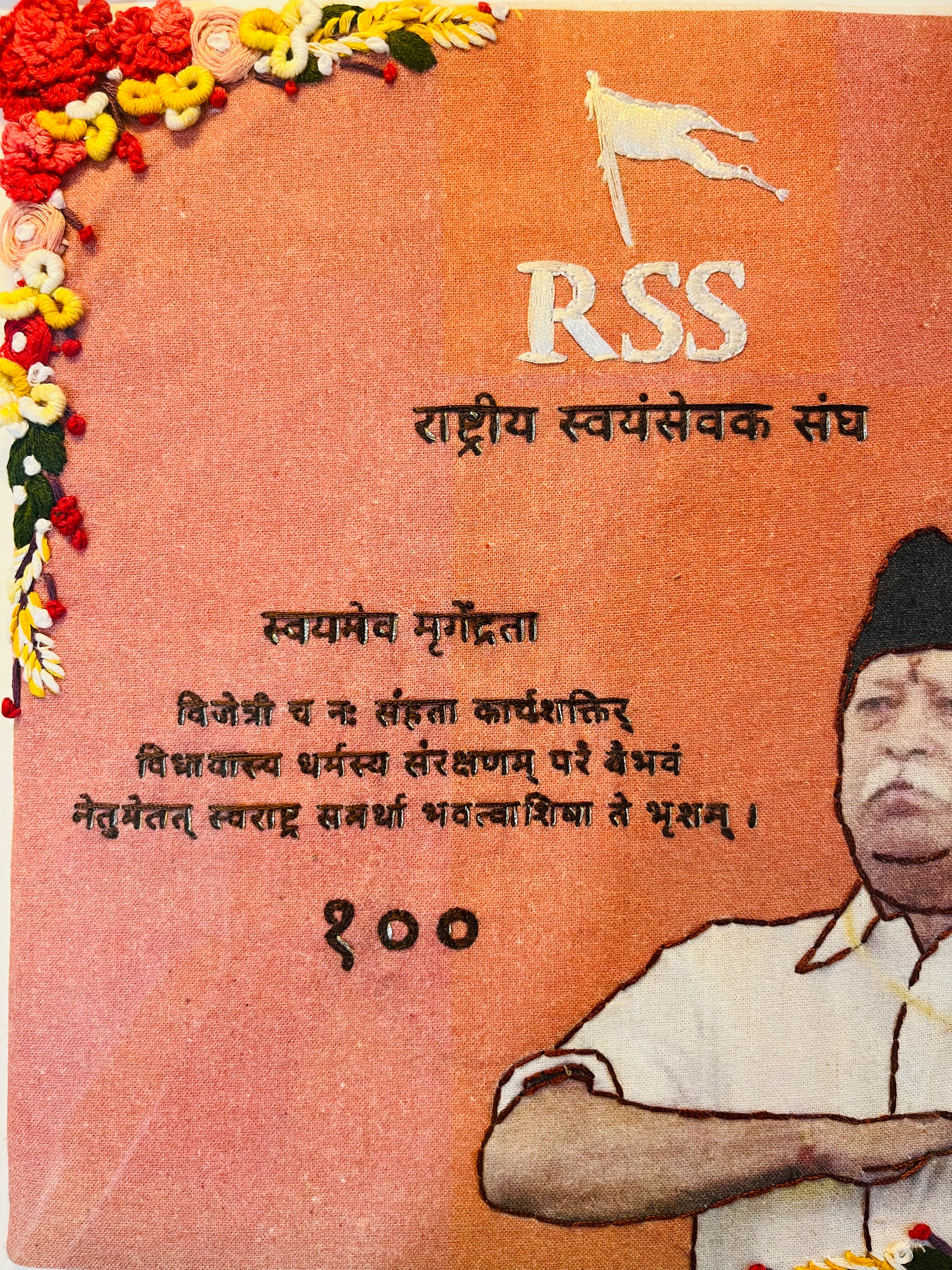 This handcrafted embroidery piece was custom-made as a heartfelt tribute to Dr. Mohanji Bhagwat, featuring his printed portrait, the iconic RSS logo, a personalized message, and delicate floral detailing in two corners.