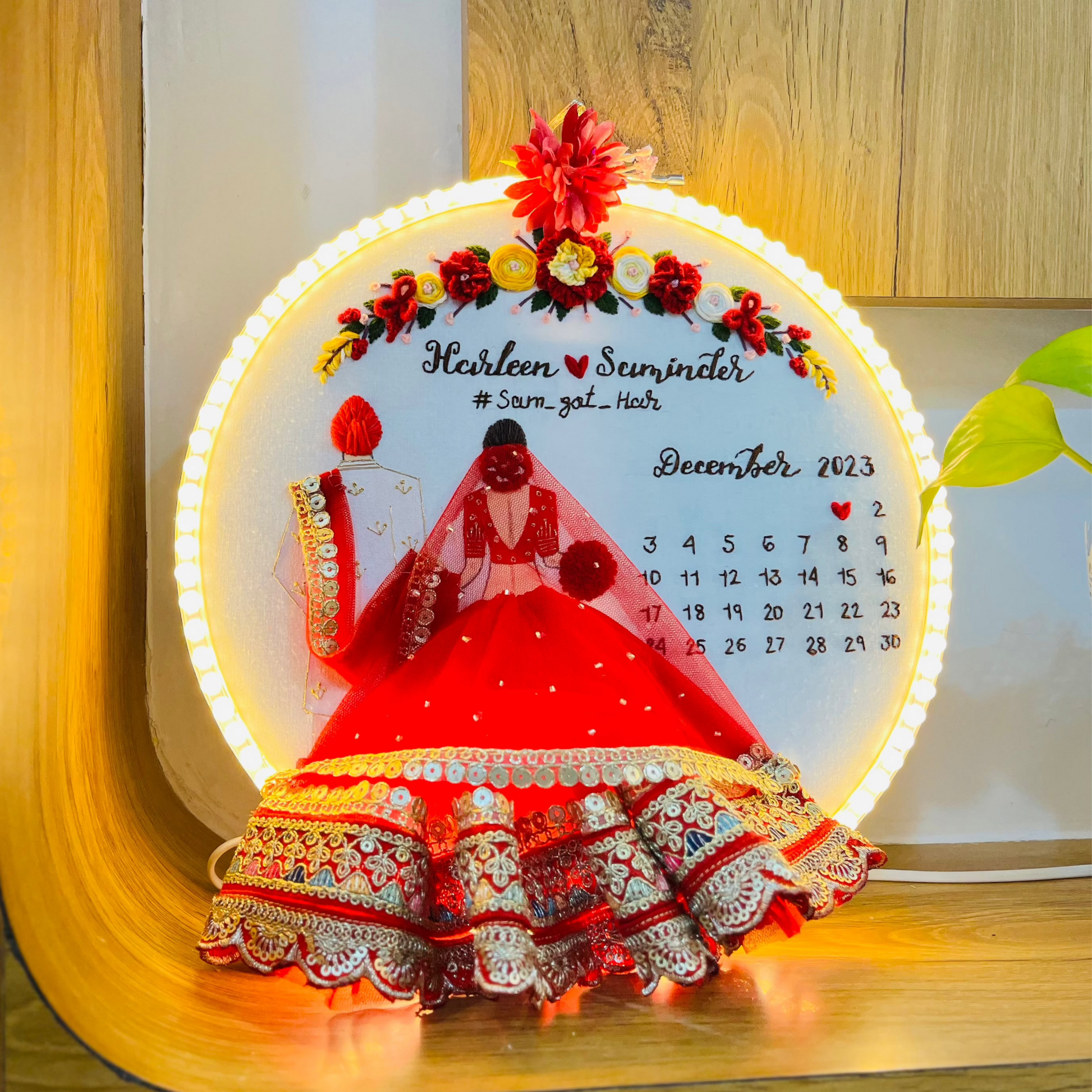 Our Glow Edition – Semi Prime Hoopart is designed to beautifully light up your memories. Featuring a lovingly handcrafted back pose of the couple, this piece includes refined floral embroidery, detailed outfits with 3 lace lines on the lehenga, and customizable dupatta styles—all now gently illuminated with soft LED lighting.