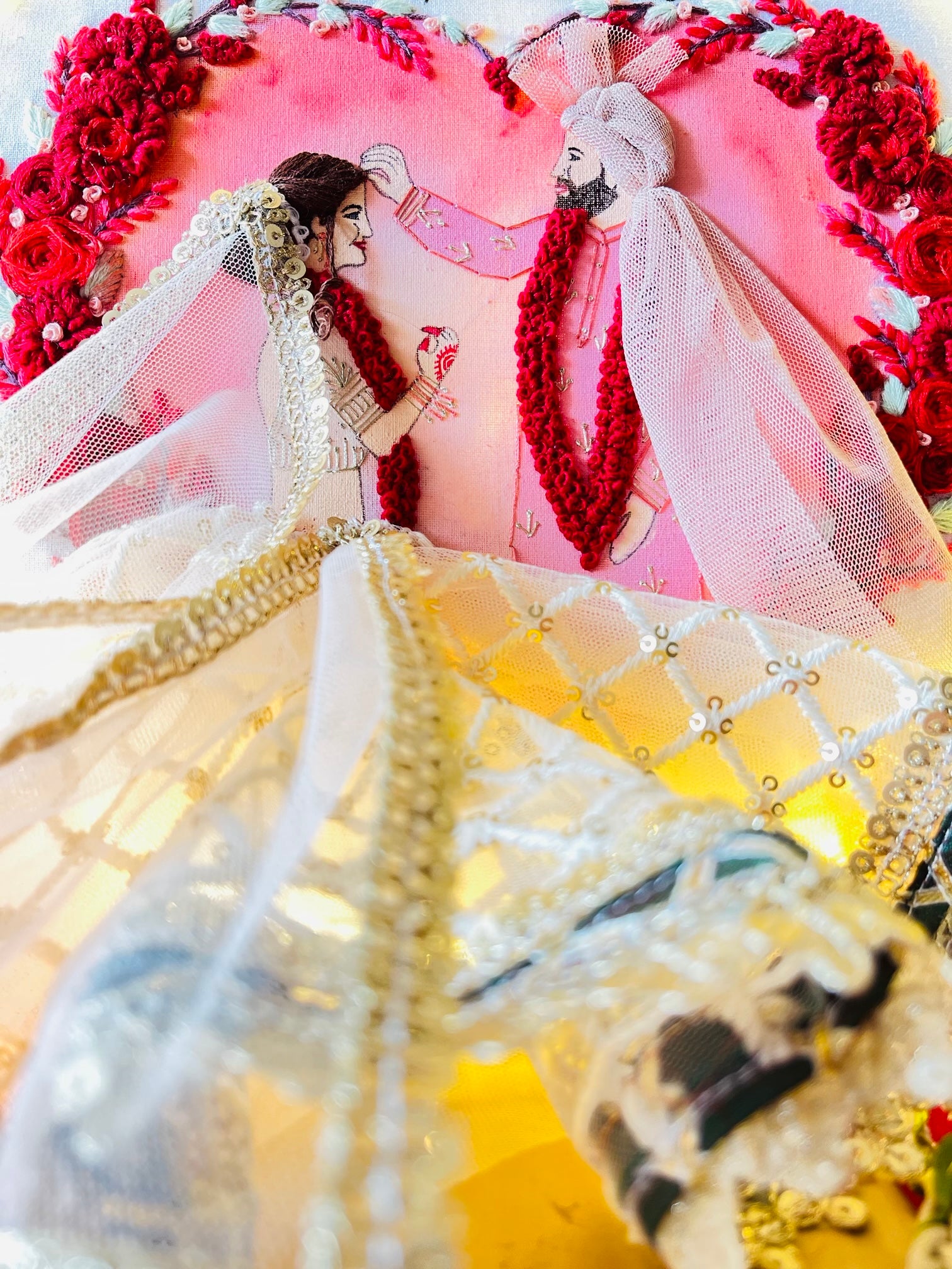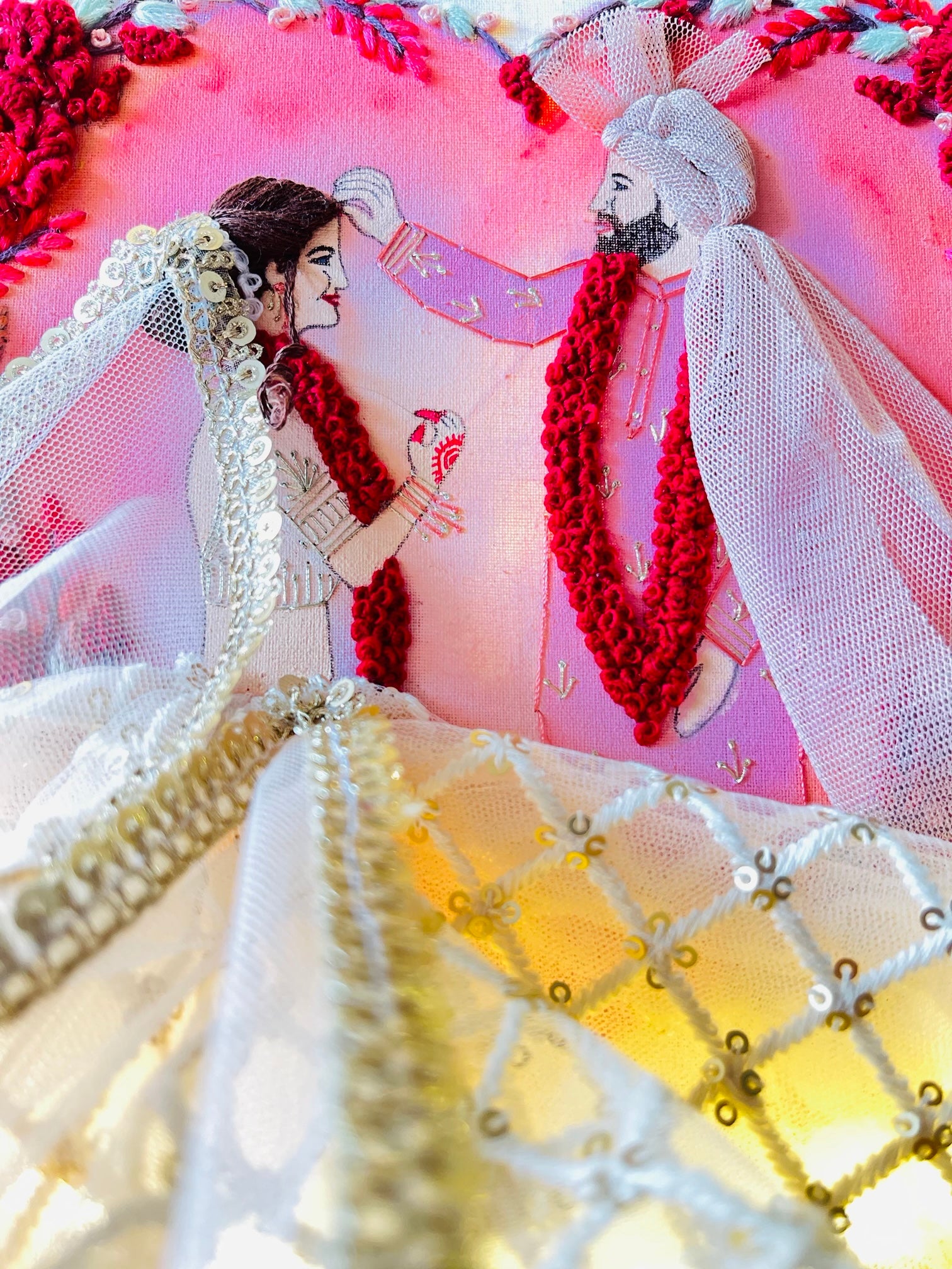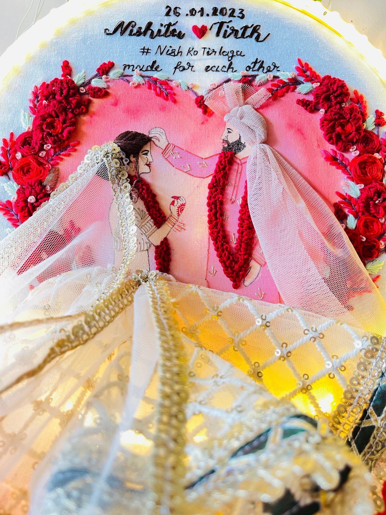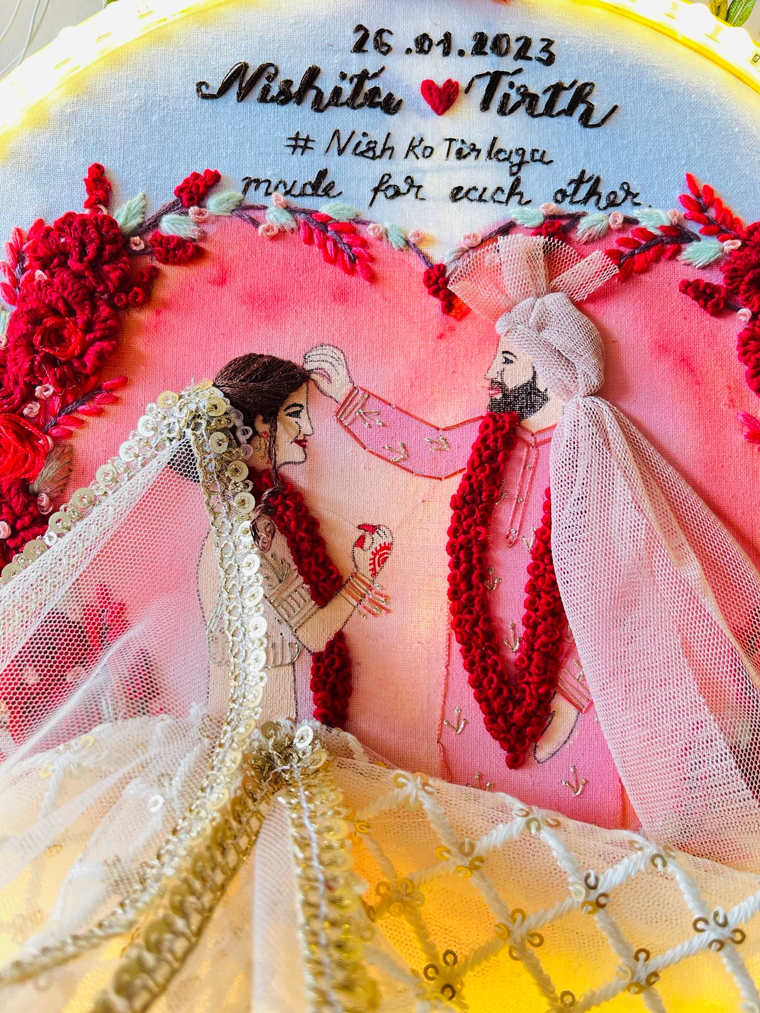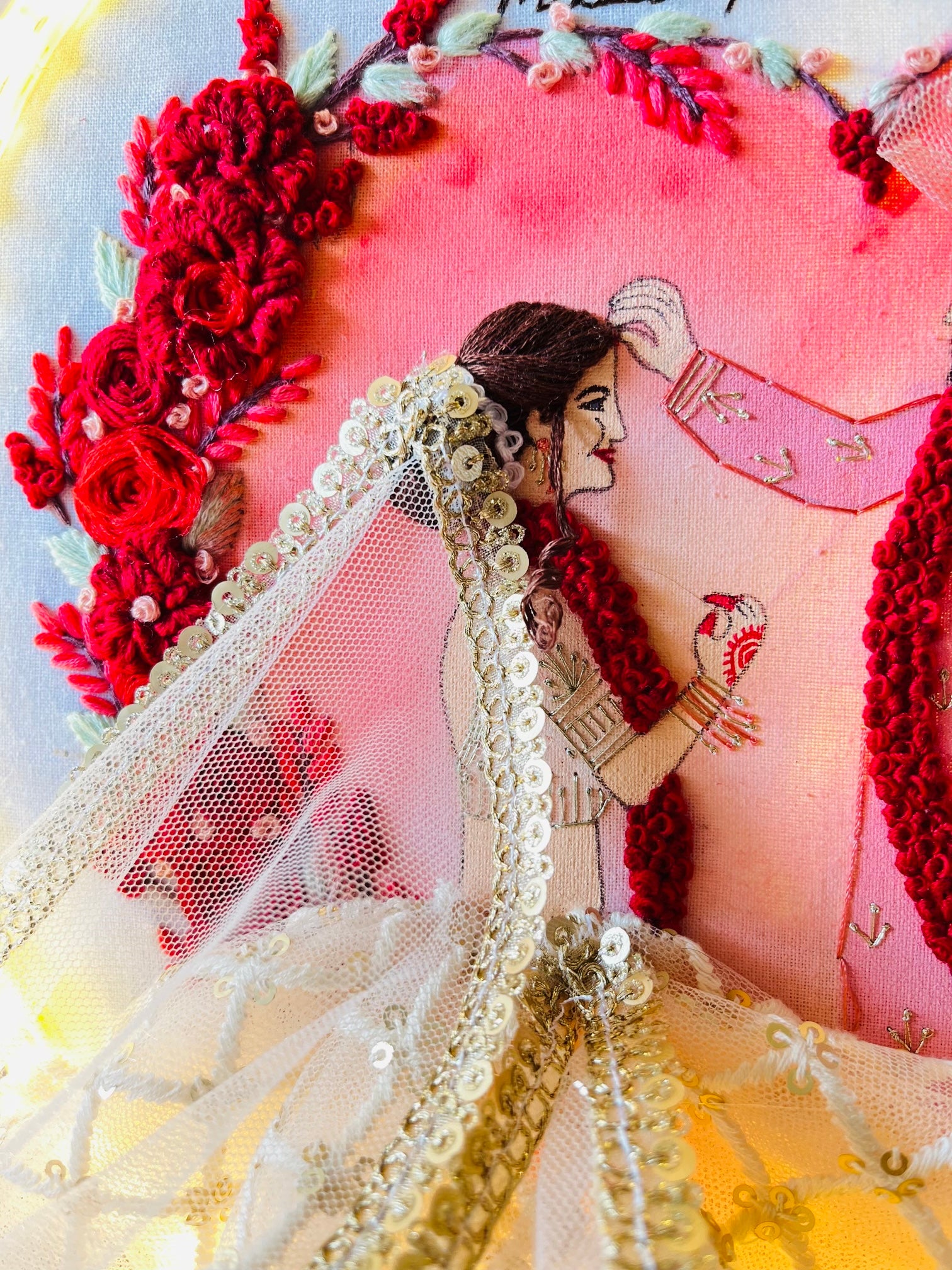 Celebrate the magic of your wedding day with this luxurious handcrafted embroidery hoop art, featuring a sindoor applying couple dressed in intricately embroidered outfits. The bride’s lehenga is adorned with layers of embroidered lace, sequins, and a flowing dupatta, while the groom’s sherwani is detailed with realistic fabric drapes and a turban.