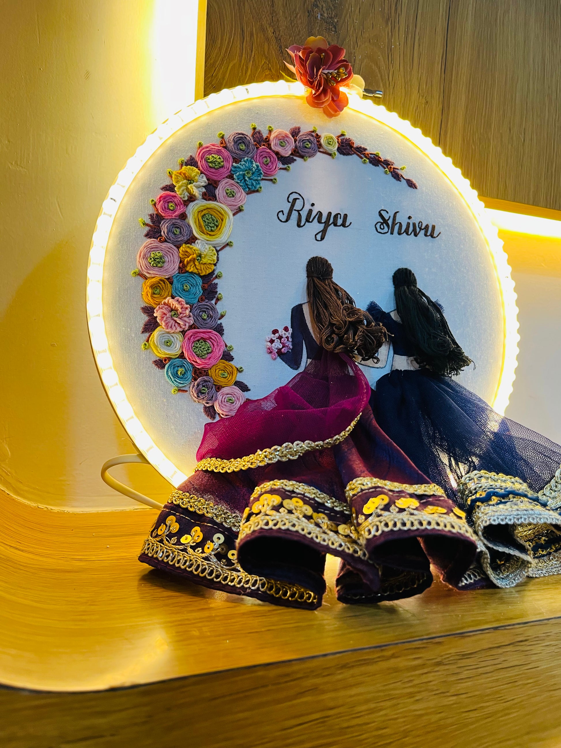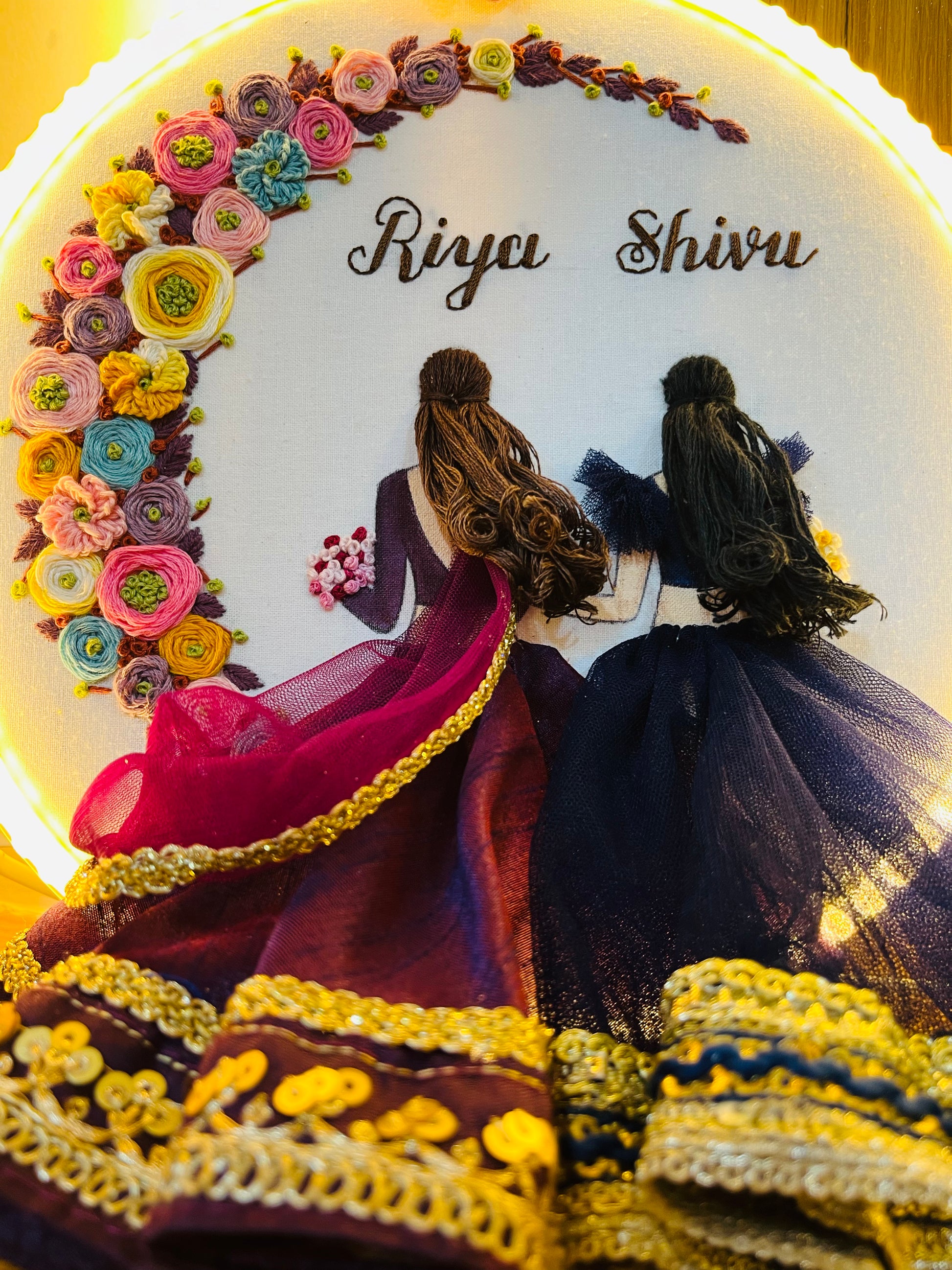 Celebrate the unbreakable bond of sisters with this handcrafted LED Hoop Art. Featuring two sisters in intricately embroidered outfits, surrounded by a blooming floral arch, this piece captures love, warmth, and lifelong friendship. Perfect as a heartfelt gift for Raksha Bandhan, birthdays, or just to say “I love you” to your sister.