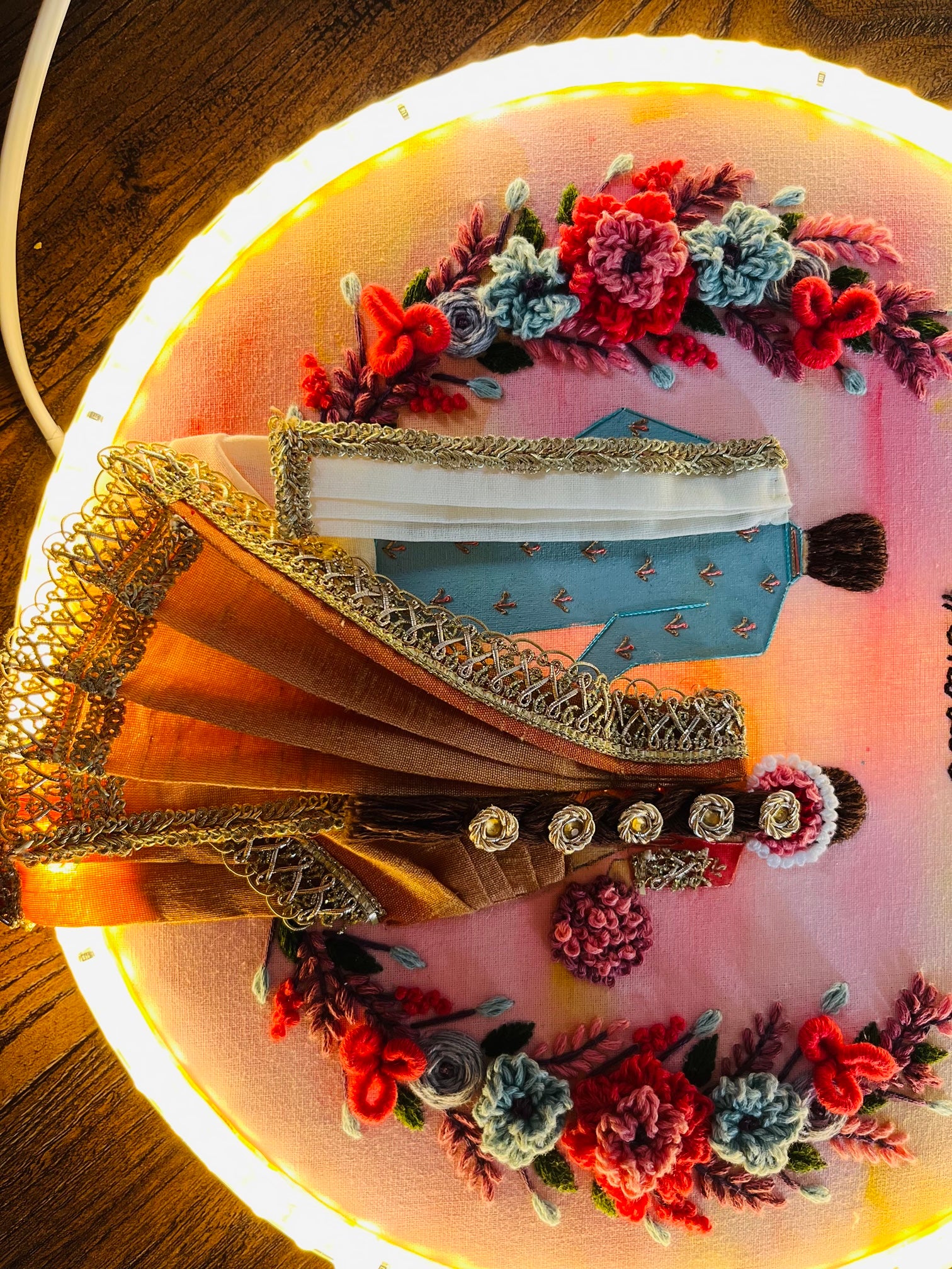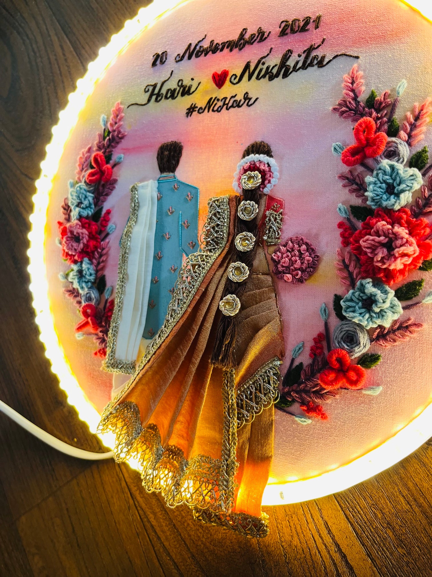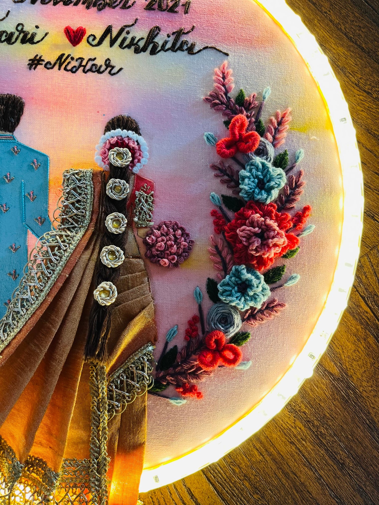 A tribute to the elegance of South Indian weddings, this handcrafted embroidery hoop captures the essence of your special day with tradition, color, and light. Featuring a custom painted background, realistic 3D wedding outfits, and a glowing LED halo, this piece turns your love story into timeless wall art.
