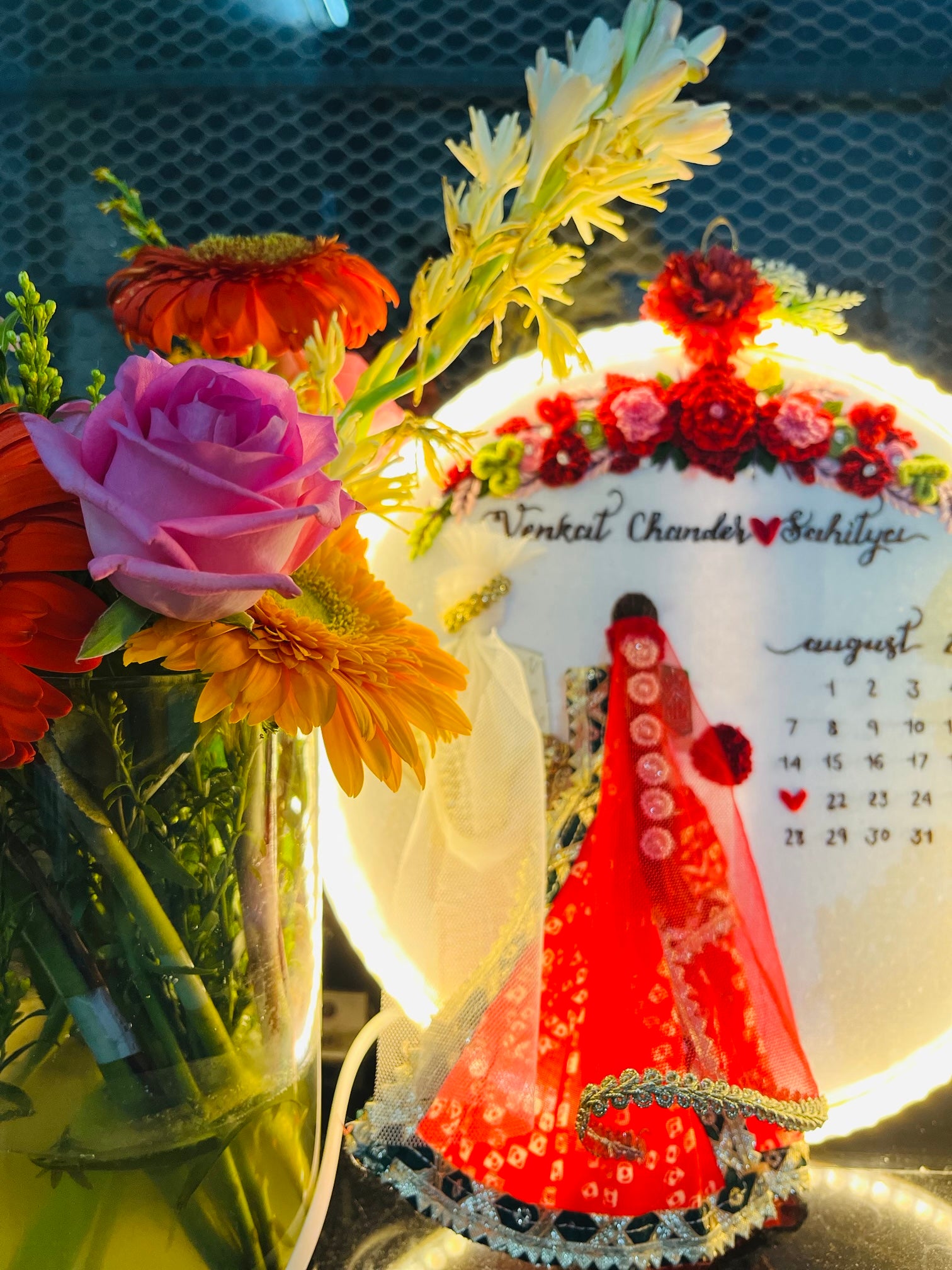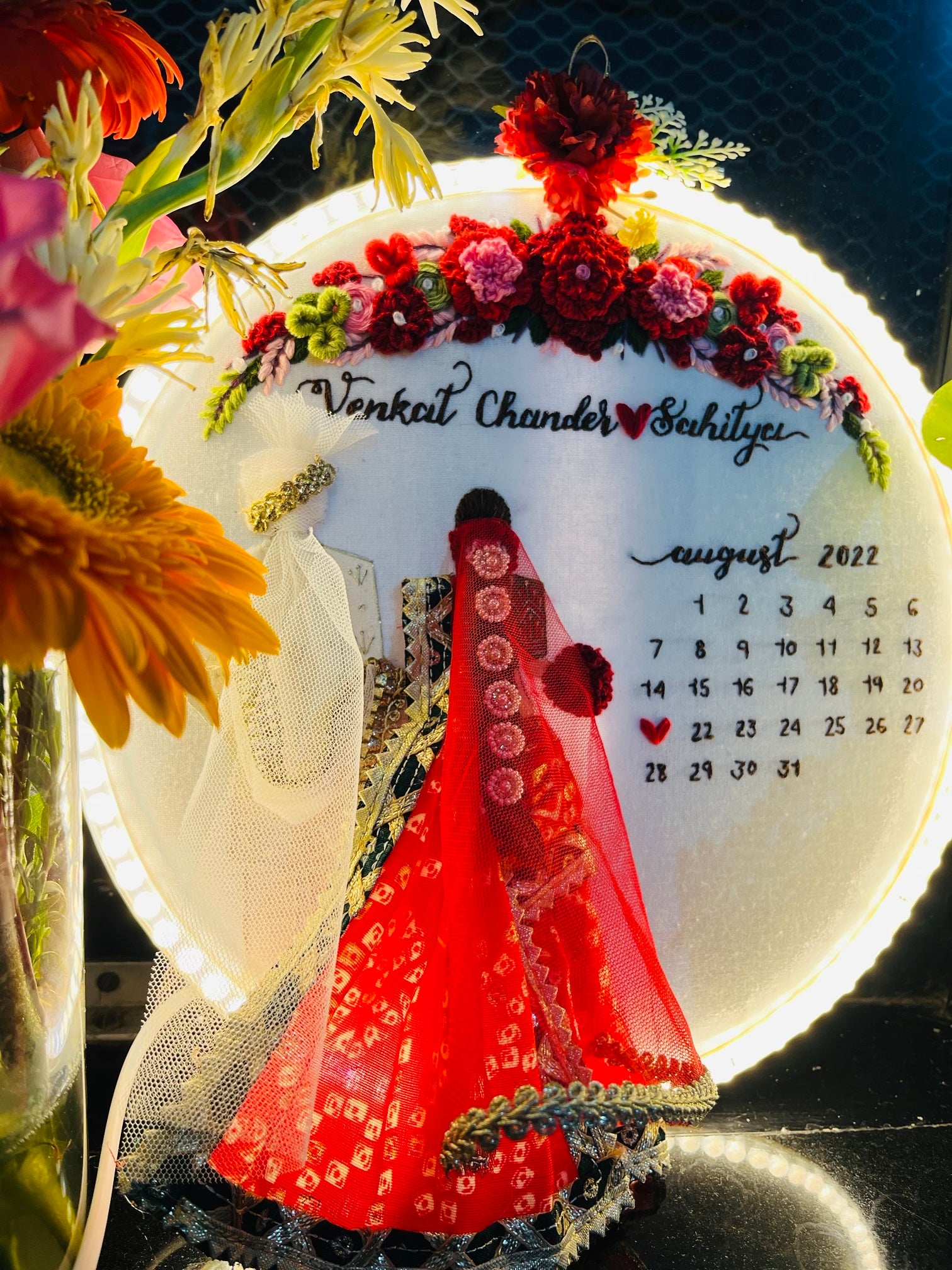 A tribute to the elegance of South Indian weddings, this handcrafted embroidery hoop captures the essence of your special day with tradition, color, and light. Featuring a custom painted background, realistic 3D wedding outfits, and a glowing LED halo, this piece turns your love story into timeless wall art.