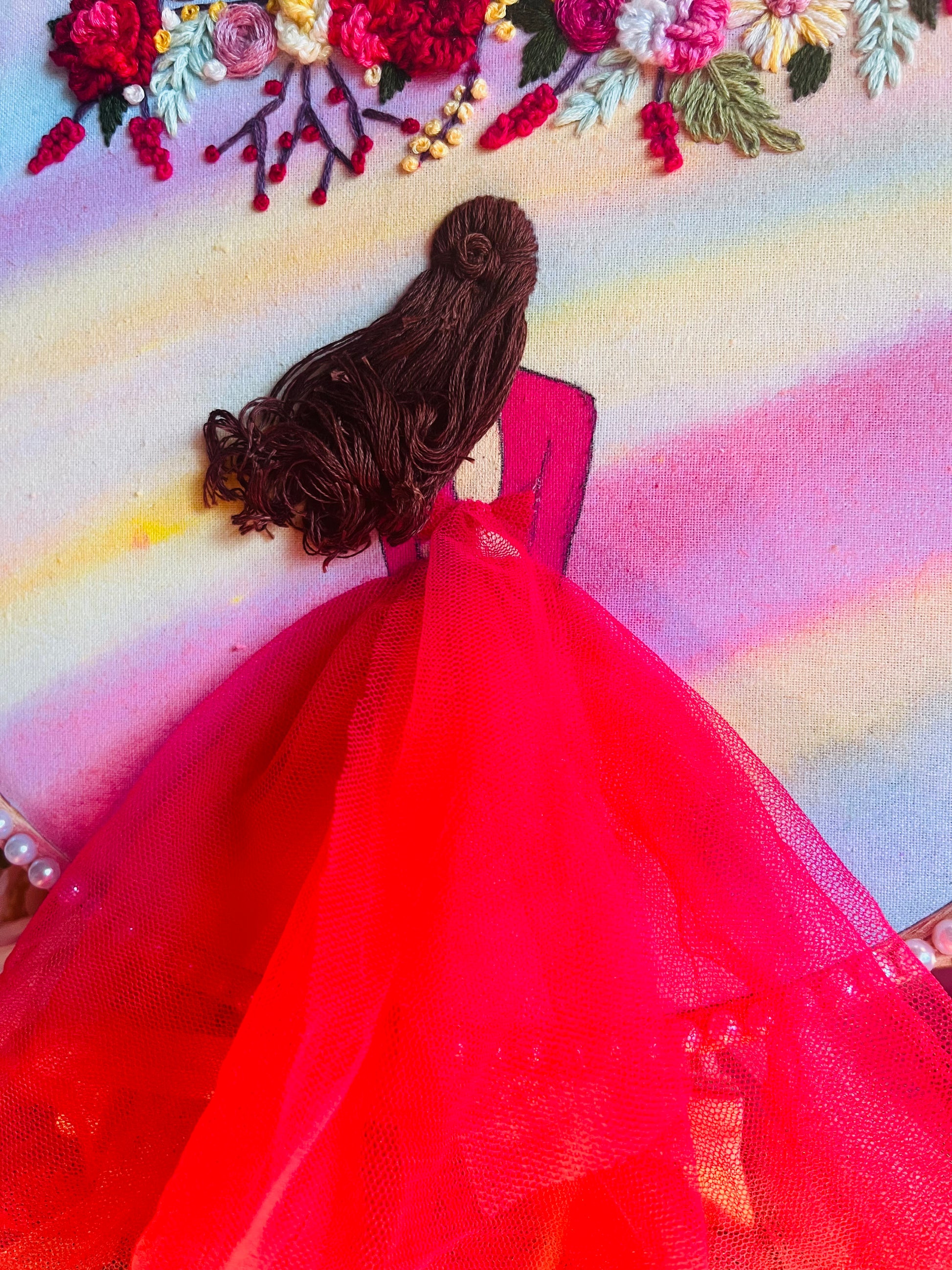Celebrate her unique charm with this vibrant, handcrafted name hoopart! Featuring a stunning girl in a flowing 3D gown, this design blends hand embroidery, florals, and soft pastel background shades to create a truly magical keepsake.
